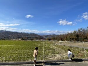 少し上がれば北アルプスの連なりを拝めるぅ。ヤッホーを連発する子どもたち。